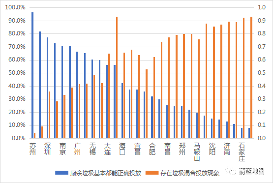 蘇州廚余垃圾正確投放率超過90.0%,武漢、石家莊隨手拍結果中顯示存在多種垃圾混合投放的比例超過90%。圖 4 30個城市觀查到廚余垃圾正確投放和混合投放隨手拍占比