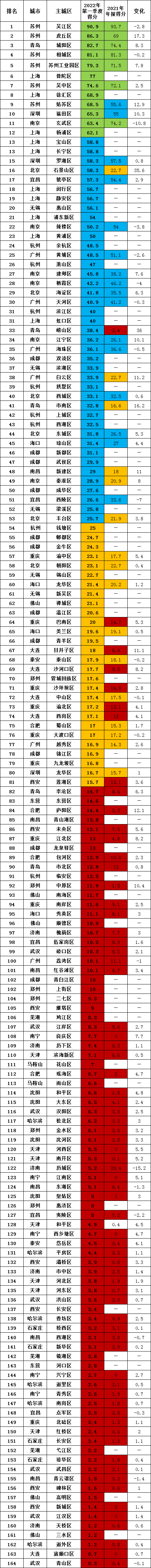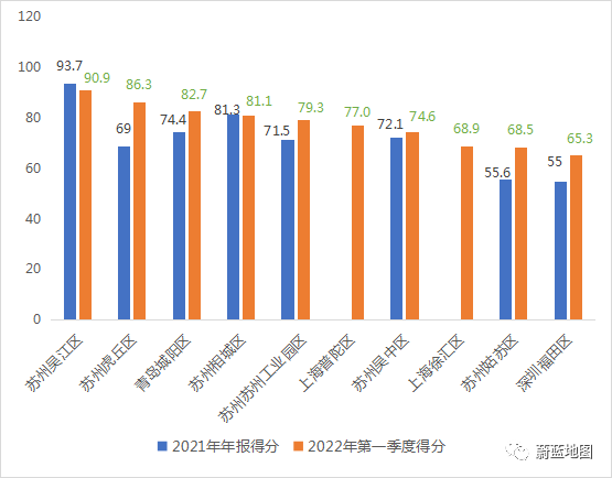 得分前十的城市主城區(qū)中,蘇州參評的六個城區(qū)依舊盡數(shù)在榜,位次略有變化,吳江區(qū)以90.9分保持第一,虎丘區(qū)、姑蘇區(qū)得分有明顯增長。上海普陀區(qū)、徐匯區(qū)取代南京玄武區(qū)和深圳羅湖區(qū)進入前十,位居第六和第八。