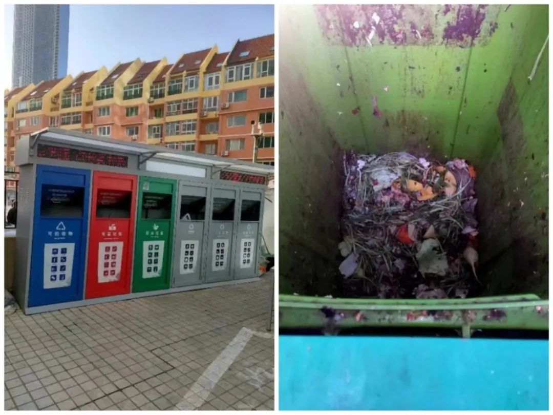 圖10 北京市石景山區(qū)久筑社區(qū)居民在破袋投放廚余垃圾,拍攝:光明之子_1097570,拍攝時間:2022年2月4日(左)、2022年2月15日(右)