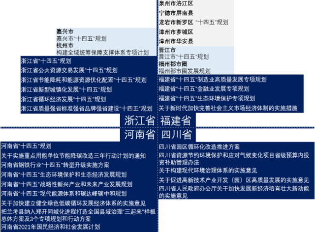 從政策層級看,試點四省中福建省的政策規(guī)劃覆蓋在省、市、區(qū)三級,浙江省政策覆蓋省、市兩級,河南省與四川省主要在省級層面支持用能權交易市場發(fā)展。浙江省與河南省在省級“十四五”總體規(guī)劃中明確將推進用能權市場化交易、探索用能權交易與碳排放權等其它環(huán)境權益交易市場協(xié)同,河南省進一步明確將“建立用能預算管理體系,加強能耗在線監(jiān)測系統(tǒng)建設與大數(shù)據(jù)分析,探索與用能權交易協(xié)同聯(lián)動”。