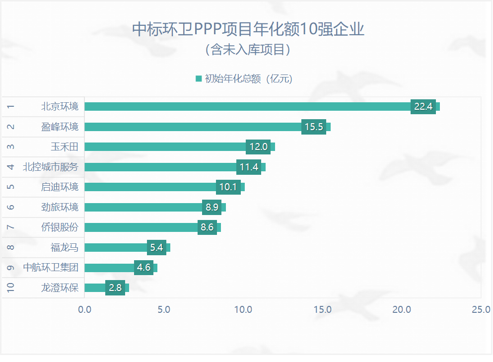 在337個已開標環(huán)衛(wèi)PPP項目中,北京環(huán)境已中標環(huán)衛(wèi)PPP項目年化總額超過22億元(按初始年化額計算),排名第一,占全部已開標環(huán)衛(wèi)PPP項目年化總額的13%。