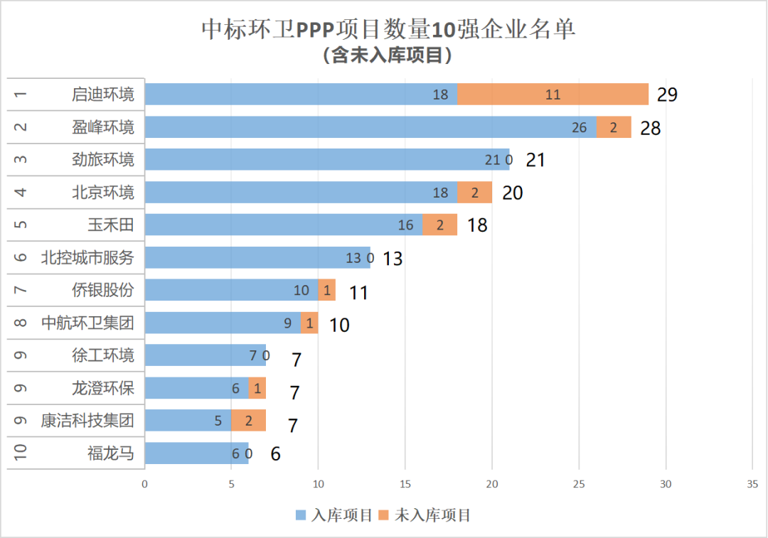 在337個已開標環(huán)衛(wèi)PPP項目中,啟迪環(huán)境已中標環(huán)衛(wèi)PPP項目數(shù)量多達29個,排名第一,占全部已已開標環(huán)衛(wèi)PPP項目總量的8.6%。