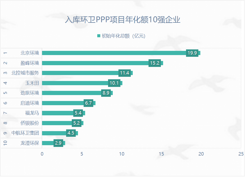 在302個入庫且已開標環(huán)衛(wèi)PPP項目中,北京環(huán)境入庫項目年化總額接近20億元(按初始年化額計算),排名第一,占全部已入庫且已開標環(huán)衛(wèi)PPP項目年化總額的13%。