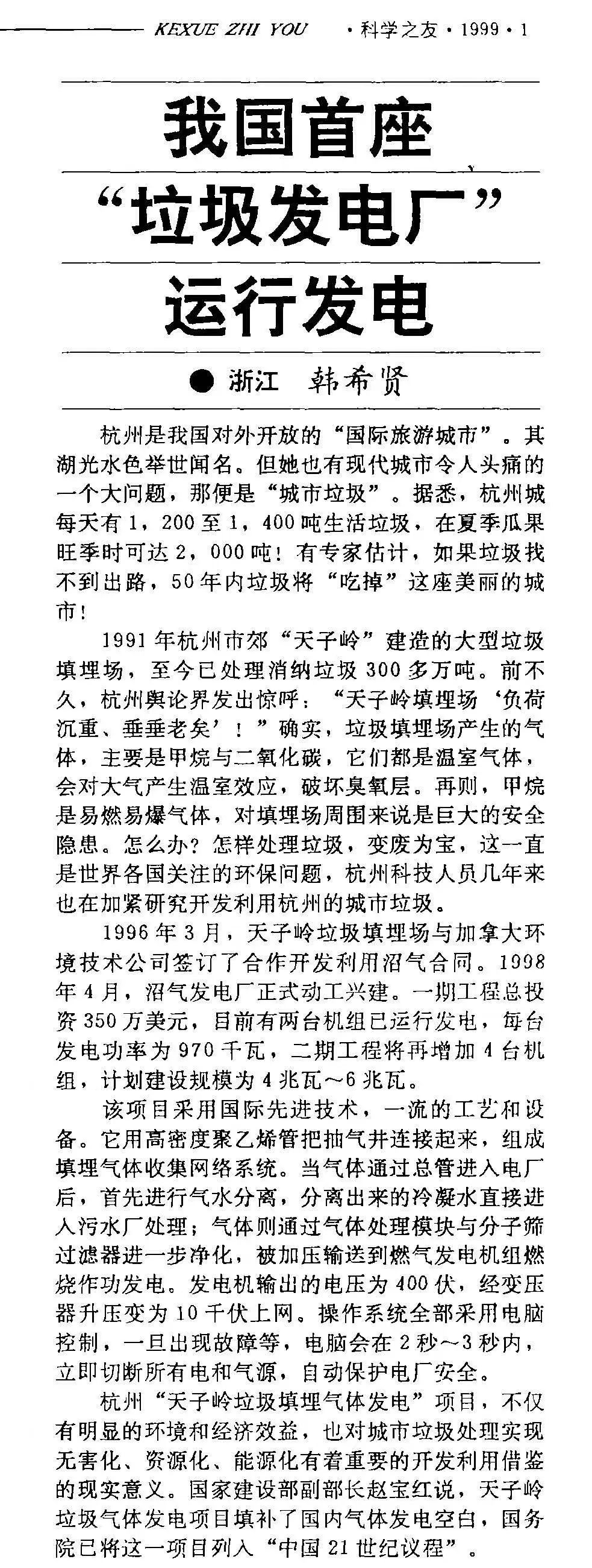據當時的媒體報道,1996年3月,天子嶺垃圾填埋場與一家加拿大公司簽訂了合作開發(fā)利用沼氣合同。1998年4月,沼氣發(fā)電廠正式動工興建。一期工程總投資350萬美元,安裝兩臺發(fā)電機組,每臺發(fā)電功率為970千瓦,二期工程將再增加4臺機組,計劃建設規(guī)模為4~6兆瓦。報道原文表示,杭州“天子嶺垃圾填埋氣體發(fā)電”項目不僅有明顯的環(huán)境和經濟效益,也對城市垃圾處理實現(xiàn)無害化、資源化、能源化有著重要的開發(fā)利用借鑒的現(xiàn)實意義。時任原建設部副部長的趙寶紅說,天子嶺垃圾氣體發(fā)電項目填補了國內氣體發(fā)電空白,國務院已將這一項目列入“中國21世紀議程”。天子嶺垃圾填埋場的設計、施工、運維及其在滲濾液處理、沼氣發(fā)電等方面的一系列創(chuàng)新,堪稱是中國生活垃圾衛(wèi)生填埋技術發(fā)展史的一部“縮影”。在1990年代前后,國內先后建成了上海老港生活垃圾填埋場、蘇州市七子山生活垃圾填埋場、濟南市生活垃圾無害化處理廠等一批大型生活垃圾衛(wèi)生填埋設施,導引著中國生活垃圾處理進入“衛(wèi)生填埋”新時代。而在那之前,我們的生活垃圾還只能簡單堆放、簡易填埋,甚至直接傾倒入河流、海洋。可以說,生活垃圾“衛(wèi)生填埋”是國內首個徹底改變全國生活垃圾處理現(xiàn)狀的新技術,地位絕不啻于后來風行的垃圾焚燒發(fā)電。從1991年到2020年,包括一埋場和二埋場在內,整個天子嶺垃圾填埋場總計處理生活垃圾近3000萬噸。隨著杭州市生活廢棄物管理轉型升級,杭州市生活垃圾處理逐漸形成“焚燒為主、資源化為輔、填埋為保障”的新格局。2020年12月16日23時58分,隨著最后一張覆蓋膜的密閉完成,天子嶺垃圾填埋場正式結束填埋主力的角色。