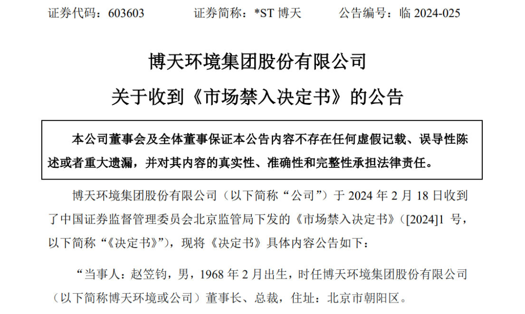 博天環(huán)境受處罰一事又有新進(jìn)展。2月19日,博天環(huán)境公告稱,公司于2月18日收到北京證監(jiān)局下發(fā)的《市場(chǎng)禁入決定書》,認(rèn)定博天環(huán)境2017年、2018年、2019年、2020年、2021年年度報(bào)告存在虛假記載,構(gòu)成《證券法》所述的信息披露違法行為。