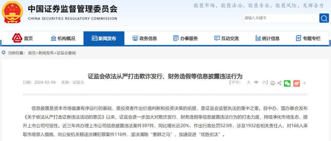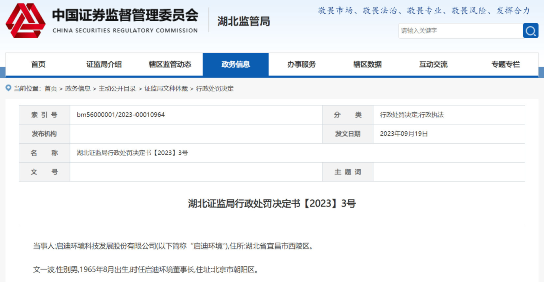 就在上個(gè)月,1月7日晚間,興源環(huán)境公告收到《行政處罰決定書》,因全資子公司存在虛增項(xiàng)目收入及成本等情況,導(dǎo)致公司財(cái)務(wù)數(shù)據(jù)存在虛假記載,興源環(huán)境及公司財(cái)務(wù)總監(jiān)分別被罰。《行政處罰決定書》顯示,興源環(huán)境的全資子公司——杭州中藝生態(tài)環(huán)境工程有限公司(下稱“中藝生態(tài)”)于2016年、2017年在長(zhǎng)興縣美麗城鎮(zhèn)(標(biāo)段一、標(biāo)段二)PPP項(xiàng)目、溫州洞頭區(qū)本島海洋生態(tài)廊道整治修復(fù)工程PPP項(xiàng)目中存在虛增項(xiàng)目收入及成本等情況,導(dǎo)致興源環(huán)境2016年至2022年年報(bào)財(cái)務(wù)數(shù)據(jù)及相關(guān)披露存在虛假記載。浙江證監(jiān)局決定,對(duì)興源環(huán)境責(zé)令改正,給予警告,并處以200萬(wàn)元罰款;對(duì)公司財(cái)務(wù)總監(jiān)孫穎給予警告,并處以80萬(wàn)元罰款。事實(shí)上,興源環(huán)境接受處罰多少有點(diǎn)“冤枉”,因?yàn)?span style="margin: 0px; padding: 0px; outline: 0px; max-width: 100%; box-sizing: border-box !important; overflow-wrap: break-word !important;">此次導(dǎo)致處罰的中藝生態(tài)是興源環(huán)境收購(gòu)而來的,2016年才納入合并報(bào)表,當(dāng)時(shí)雙方還簽署了業(yè)績(jī)承諾補(bǔ)償協(xié)議。這次虛增項(xiàng)目收入的事件爆發(fā)后,興源環(huán)境也表示,將高度重視業(yè)績(jī)承諾補(bǔ)償?shù)淖酚懝ぷ?,擬安排專門隊(duì)伍并聘請(qǐng)專業(yè)機(jī)構(gòu)進(jìn)行研判,切實(shí)推動(dòng)相關(guān)工作有效開展。還有此前曾被媒體曝出過“財(cái)務(wù)造假”的啟迪環(huán)境。2023年9月,湖北證監(jiān)局官網(wǎng)披露,因信息披露違法,對(duì)啟迪環(huán)境給予警告并處罰款60萬(wàn)元,對(duì)時(shí)任董事長(zhǎng)文一波等4位相關(guān)責(zé)任人給予警告并處罰款30萬(wàn)元。▼圖片來源:中國(guó)證券監(jiān)督管理委員會(huì)調(diào)查顯示,啟迪環(huán)境在2017年-2018年間,通過偽造虛假分包合同及節(jié)點(diǎn)結(jié)算單確認(rèn)成本,虛構(gòu)了相關(guān)PPP項(xiàng)目(向社會(huì)資本開放的基礎(chǔ)設(shè)施建設(shè)和公共服務(wù)項(xiàng)目)合同完工百分比,提前確認(rèn)或虛假確認(rèn)總包合同收入,導(dǎo)致啟迪環(huán)境2017、2018年年報(bào)中主營(yíng)業(yè)務(wù)收入、主營(yíng)業(yè)務(wù)成本等項(xiàng)目存在虛假記載。2023年7月,龍凈環(huán)保收到中國(guó)證監(jiān)會(huì)福建監(jiān)管局的行政處罰決定書,認(rèn)定ST龍凈未按規(guī)定披露關(guān)聯(lián)交易,決定對(duì)公司給予警告,并處以一百萬(wàn)元罰款。還有幾位相關(guān)責(zé)任人分別給予了警告和數(shù)額不等的罰款。再往前一個(gè)月,2023年6月,美尚生態(tài)也曾收到中國(guó)證監(jiān)會(huì)的行政處罰決定書,認(rèn)定美尚生態(tài)2015年公司招股說明書、2015年至2019年年報(bào)、2020年半年報(bào)、2016年非公開發(fā)行股份及支付現(xiàn)金購(gòu)買資產(chǎn)并募集配套資金暨關(guān)聯(lián)交易報(bào)告書、2017年面向合格投資者公開發(fā)行公司債券募集說明書等信息披露文件存在虛假記載,決定對(duì)其責(zé)令改正,給予警告,并處以1330萬(wàn)元罰款。更早以前,卓錦股份于2023年5月,*ST科林于2023年2月,也曾分別收到過證監(jiān)部門的處罰決定書,責(zé)令改正,給予警告,并處以一定數(shù)額的罰款。*ST科林的兩位相關(guān)當(dāng)事人杜簡(jiǎn)丞、李根旺還被分別采取了3年證券市場(chǎng)禁入措施。證監(jiān)會(huì)嚴(yán)打財(cái)務(wù)造假