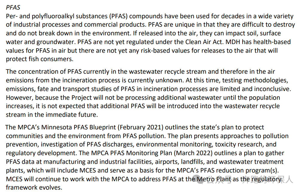 明尼蘇達污泥焚燒項目四期的環(huán)境評估表中可以發(fā)現(xiàn),美國對污泥焚燒中PFAS(全氟和多氟烷基物質)的排放也已經(jīng)開始關注。