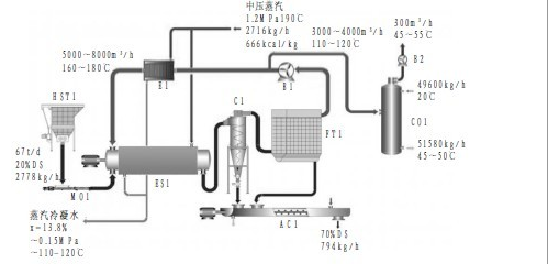 如圖1 ,污泥的蒸汽熱干化技術(shù)采用以工 業(yè)蒸汽為干燥介質(zhì),通過污泥干燥機(jī)將含水率 為7 0 % 的污泥經(jīng)螺旋輸送機(jī)(M01 )送達(dá)污泥 干燥機(jī)(ES1),來自工業(yè)用中壓蒸汽將乏氣(由 污泥干后形成的廢氣)加熱至110℃,送入干燥 機(jī)(E S 1 )的入口,與入口污泥進(jìn)行混合預(yù)熱, 同時,在干燥機(jī)(ES1)筒體外殼內(nèi)通入工業(yè)用 中壓蒸汽,作為污泥干燥的主要熱源,采用與 污泥逆流換熱的方式進(jìn)行熱量傳導(dǎo),干燥后的 污泥與干燥過程中產(chǎn)生的乏氣一起進(jìn)入旋風(fēng)分 離器(C 1 ),其中9 5 % 以上的干燥污泥在旋風(fēng) 分離器(C 1 )中被分離,另外5 % 的污泥與乏 氣在布袋除塵器(F T 1 )中被收集,并共同進(jìn) 入螺旋輸送AC1 輸送出系統(tǒng);被分離出的乏氣, 一部分(約20%)進(jìn)入下一輪污泥干燥循環(huán),另 一部分(約80%)通過活性炭吸附器(CO1)除臭后排入大氣。