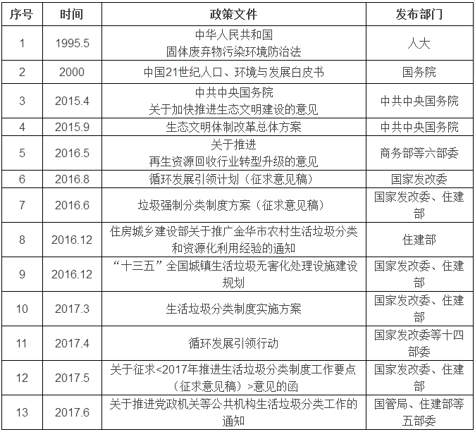 為推動我國垃圾分類實施,國家陸續(xù)出臺了不少相關政策。早在1995年發(fā)布、2016年修訂的《中華人民共和國固體廢棄物污染環(huán)境防治法》中,第37條就已經(jīng)規(guī)定:“城市生活垃圾應當逐步做到分類收集、貯存、運輸及處置”;