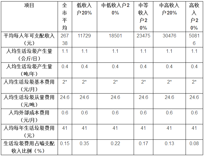 學者張紅艷曾探討過垃圾定量收費標準是否在居民可承受能力范圍內。根據(jù)其論文《城市生活垃圾計量收費模式探討》,她參考垃圾處理產(chǎn)業(yè)適當利潤率、環(huán)保部門年平均運營成本等,核算出2009年北京居民應繳納的垃圾綜合處理費為30.6元/噸(6元基本費+24.6元從量費)最終得出的結論為:計量收取的垃圾處理費在人均可支配收入比例中占比較小,以北京市為例,其平均占比為0.15%。