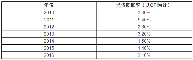 根據(jù)國家統(tǒng)計局官方數(shù)據(jù),2010-2016年的通貨膨脹率如下: