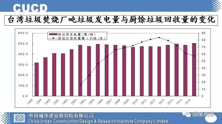 下面這張圖可以看出臺灣地區(qū)的廚余回收量的變化對焚燒發(fā)電效率的影響基本沒有。臺灣地區(qū)雖然聲稱廚余垃圾分類收集做得好,但廚余垃圾的回收利用要明顯落后,臺灣第一個廚余垃圾厭氧處理廠今年才動工,計(jì)劃2018年底才能投入運(yùn)營。