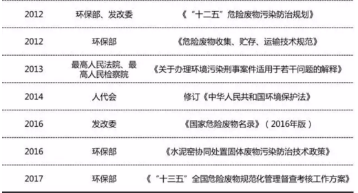 危廢政策不斷出臺(tái),尤其是省級(jí)細(xì)則落地:1)2017年環(huán)保部出臺(tái)“十三五”全國危險(xiǎn)廢物規(guī)范化管理督查考核工作方案,各省近期均推出省級(jí)危廢規(guī)范化管理督查方案;2)《國家危險(xiǎn)廢物名錄》自2016年8月1日起施行;新修訂的《固體廢物污染環(huán)境防治法》取消危險(xiǎn)廢物省內(nèi)轉(zhuǎn)移審批手續(xù);3)2016年最高司法機(jī)關(guān)就環(huán)境污染犯罪出臺(tái)專門司法解釋;4)2018年起實(shí)施《環(huán)境保護(hù)稅法》,危廢稅額1000元/噸;5)環(huán)保部發(fā)布《水泥窯協(xié)同處置固體廢物污染防治技術(shù)政策》,支持水泥窯協(xié)同處置。