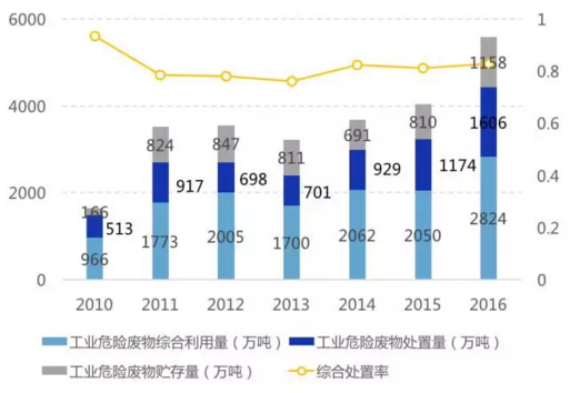 在環(huán)保監(jiān)管力度增強(qiáng),各省均推出省級(jí)督查方案背景下,危廢處置剛需再次提升,尤其是要求進(jìn)入規(guī)范渠道處置的量增加。但市場情況是,實(shí)際產(chǎn)生量遠(yuǎn)大于統(tǒng)計(jì)量(披露16年5347萬噸,預(yù)計(jì)實(shí)際8000萬噸),低綜合利用處置率(83%),低有效利用率(25%),導(dǎo)致整體危廢的處置供不應(yīng)求。