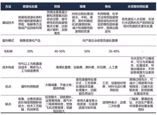 無害化中焚燒項(xiàng)目是主要增量產(chǎn)能。危廢最終處置方式主要還是焚燒與填埋,其中焚燒產(chǎn)生的飛灰、物化后的部分產(chǎn)物也需填埋,填埋容量供不應(yīng)求,目前送去填埋的大多是焚燒飛灰、重金屬污泥等無法繼續(xù)減量的廢物。但填埋方式的占地因素、處置種類、立項(xiàng)審批等缺點(diǎn)都限制了其發(fā)展。東部中部城市“垃圾圍城”現(xiàn)象嚴(yán)重,垃圾填埋場選址、工業(yè)廢物堆積儲(chǔ)存都是很大的問題,為城市擴(kuò)張、節(jié)約土地考慮,政府部門對單一的填埋項(xiàng)目將會(huì)非常慎重。而焚燒能大幅減量至5%,更節(jié)約土地,更適合我國國情。根據(jù)調(diào)研結(jié)果顯示,廣東、上海等地的危廢焚燒項(xiàng)目都處于滿產(chǎn)狀態(tài),對焚燒的需求非常旺盛。危廢無害化產(chǎn)能的增量主要來自于焚燒項(xiàng)目,水泥窯協(xié)同處置是補(bǔ)充。