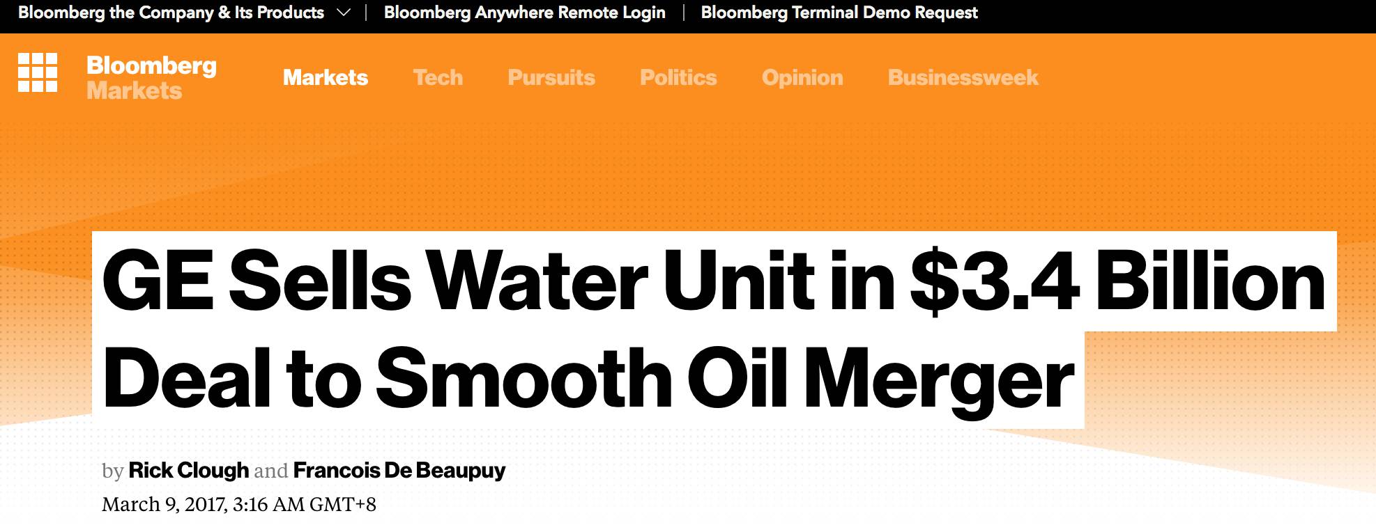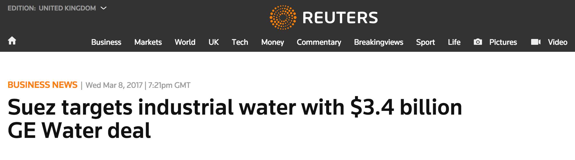 水行業(yè)巨頭法國(guó)蘇伊士環(huán)境聯(lián)合加拿大第二大養(yǎng)老金投資管理機(jī)構(gòu)—魁北克儲(chǔ)蓄投資集團(tuán)(Caisse de dép?t et placement du Québec )正式確認(rèn)收購(gòu)GE水處理。GE水處理是在2016年10月宣布出售的,之后曾出現(xiàn)過諸如威立雅、全球最大儀器公司丹納赫集團(tuán)(Danaher Corporation)、著名的私人股權(quán)投資和投資管理公司黑石集團(tuán)(Blackstone Group)等潛在買家的傳聞。 在上個(gè)月底,蘇伊士環(huán)境的新聞發(fā)言人也對(duì)外宣布正在考慮收購(gòu)GE工業(yè)水處理業(yè)務(wù)的可能性。是什么讓蘇伊士在官宣之后的半個(gè)月內(nèi)就完成這宗收購(gòu)呢?今天我們將帶大家看看全球各大媒體對(duì)這次收購(gòu)的解讀。