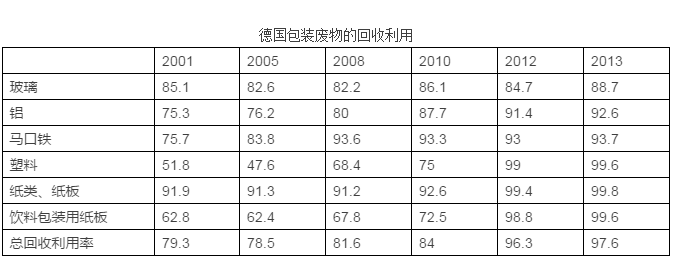 在德國,最常見的包裝材料有玻璃、鋁、馬口鐵、塑料、紙、紙板、木材,全部都能夠被用作二次原料,從而減少對原生原料的需求,可以起到降低能源消耗及污染排放的作用。根據(jù)《包裝條例》的規(guī)定,居民應(yīng)當(dāng)對包裝廢物進(jìn)行分類投放。條例獲得了廣泛的公眾支持,2013年時德國包裝廢物的回收利用率達(dá)到了97%。