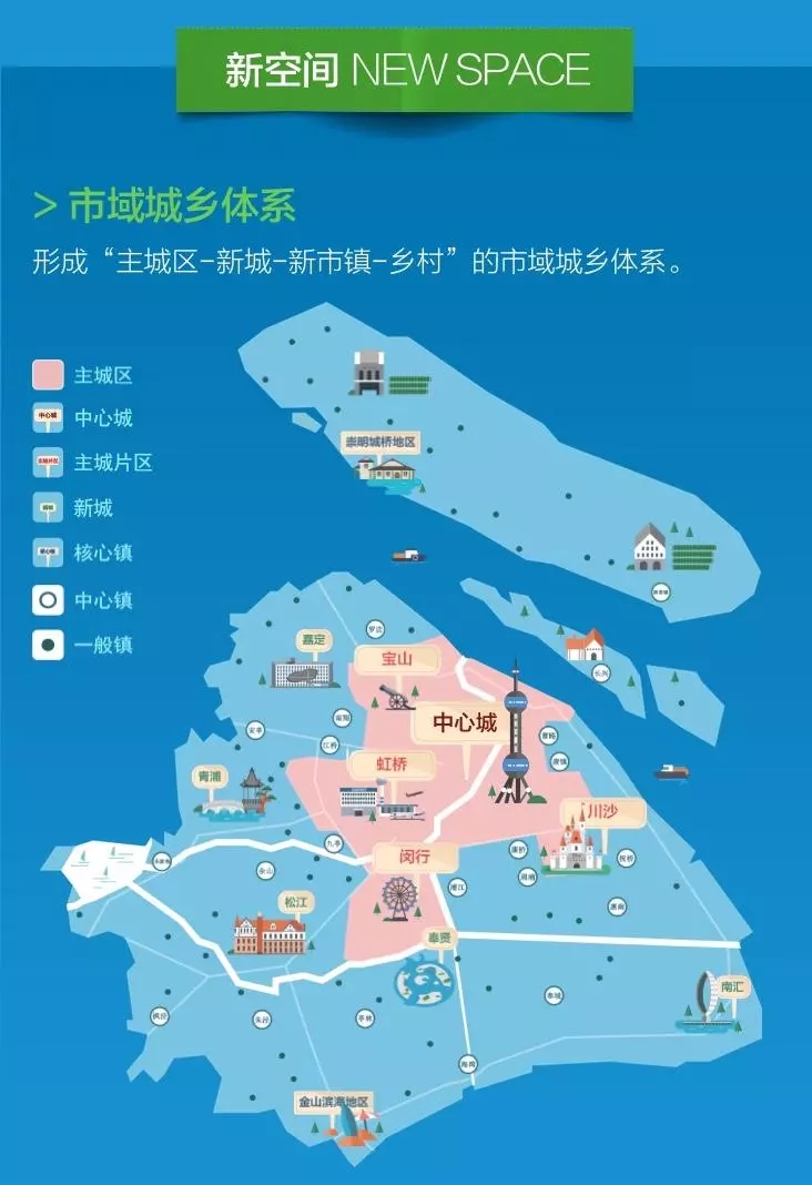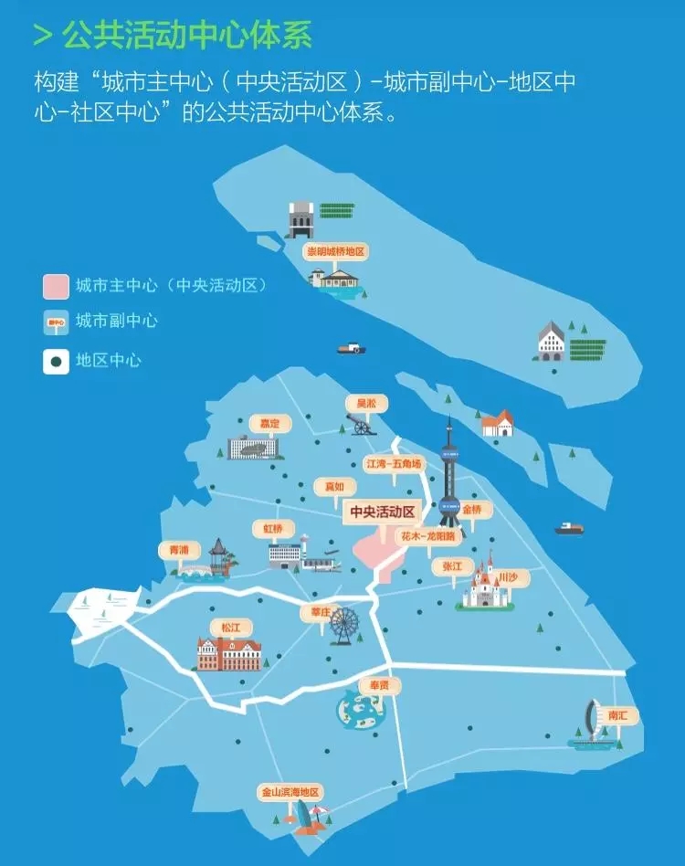 中央活動(dòng)區(qū)包括小陸家嘴、外灘、人民廣場(chǎng)、徐家匯等十幾個(gè)區(qū)域,重點(diǎn)發(fā)展金融服務(wù)、總部經(jīng)濟(jì)、商務(wù)辦公、文化娛樂(lè)、創(chuàng)新創(chuàng)意、旅游觀光等全球城市核心功能。城市副中心包括五角場(chǎng)等9個(gè)主城副中心、5個(gè)新城中心和金山濱海地區(qū)、崇明城橋地區(qū)2個(gè)核心鎮(zhèn)中心等,發(fā)展面向長(zhǎng)三角和市域的綜合服務(wù)中心,兼顧全球城市部分核心功能。地區(qū)中心和社區(qū)中心主要承擔(dān)所在區(qū)域的公共服務(wù)。