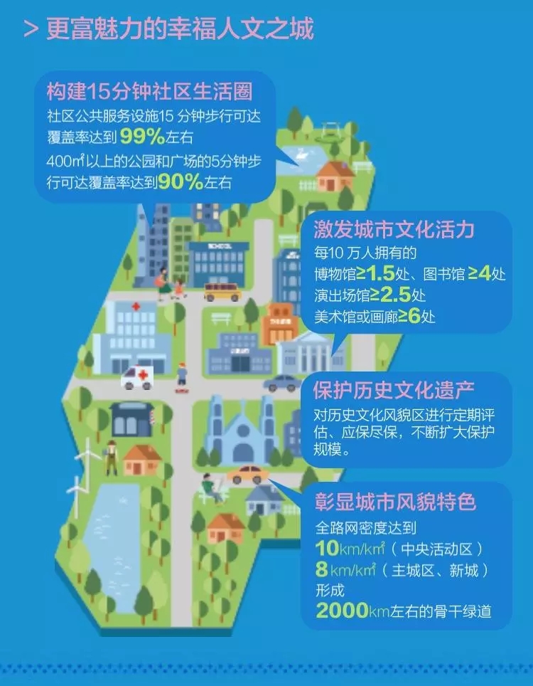 打造15分鐘生活圈,營(yíng)造幸福宜居社區(qū)。包括:打造宜居、宜業(yè)、宜學(xué)、宜游的社區(qū),優(yōu)化社區(qū)生活、就業(yè)和出行環(huán)境,建設(shè)TOD社區(qū),為城市居民提供一個(gè)全時(shí)段運(yùn)營(yíng)的城市。提供覆蓋全年齡段的公共服務(wù)保障,社區(qū)公共服務(wù)設(shè)施15分鐘步行可達(dá)覆蓋率將達(dá)到99%左右。加快建立多主體供給、多渠道保障、租購(gòu)并舉的住房制度。多渠道增加租賃性住房比重,至2035年,政府及機(jī)構(gòu)持有的租賃性住房比重約8-10%。提供人才公寓、國(guó)際化社區(qū)、適老性住宅等滿足市民多層次、多樣化的住房需求。