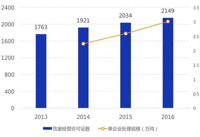 資質(zhì)企業(yè)平均規(guī)模較?。?016年我國持危險(xiǎn)廢棄物經(jīng)營許可證的企業(yè)數(shù)量為2149家,2016年凈增加僅115家,體現(xiàn)出環(huán)保系統(tǒng)對(duì)新頒發(fā)許可證愈發(fā)謹(jǐn)慎;平均每家處理量僅不到3萬噸,呈現(xiàn)較強(qiáng)的分散性特征,但單企業(yè)處理規(guī)模由2014年2.2萬噸/年增加到2016年3.0萬噸/年,未來隨著許可證頒發(fā)與復(fù)核難度加大,實(shí)力弱、技術(shù)差的小企業(yè)將被淘汰出市場(chǎng),龍頭擴(kuò)張,單企業(yè)規(guī)模繼續(xù)擴(kuò)大。