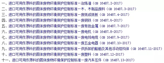 現(xiàn)行環(huán)控標準共有13項(GB 16487.1~GB 16487.13-2005),分別包括骨廢料,冶煉渣,木、木制品廢料,廢紙或紙板,廢纖維,廢鋼鐵,廢有色金屬,廢電機,廢電線電纜,廢五金電器,供拆卸的船舶及其他浮動結構體,廢塑料,廢汽車壓件,各標準控制的重點是夾雜物和放射性污染。