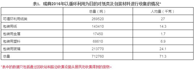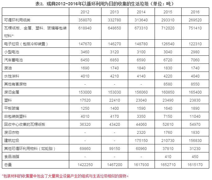 2016年時(shí),瑞典總共循環(huán)利用了161.517萬噸的生活垃圾,相當(dāng)于每人每年162千克,與2015年相比減少了2.3%,減少的主要原因?yàn)榻ㄖ臏p少,包括屋面瓦、纖維玻璃、破損的陶瓷器等。上述對(duì)以循環(huán)利用為目的進(jìn)行的收集量統(tǒng)計(jì),包括居民向生產(chǎn)商建立的循環(huán)利用系統(tǒng)投放的包裝和可循環(huán)利用的紙制品。這一部+