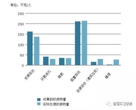 *圖表中以各種處置方法為目的進(jìn)行的收集量與各種方法的實(shí)際處置量間存在一定的差別。對(duì)資源回收利用和厭氧消化來說,收集量和處置量存在差別的原因是,一部分廢物在達(dá)到處理階段后被發(fā)現(xiàn)不符合處理的要求,通常都會(huì)在焚燒廠接受能量回收處理,因此也是能量回收的處理量稍稍高于以此為目的的收集量的原因。建筑垃圾資源回收的實(shí)際處理量要高于收集量,原因是焚燒廠產(chǎn)生的金屬和底灰會(huì)在分類后,得到循環(huán)利用。近年來,實(shí)際接受填埋處理的廢物量要原告于以填埋為目的而進(jìn)行收集的量,主要原因之一是焚燒廠能量回收會(huì)產(chǎn)生大量飛灰,只能接受填埋處置。