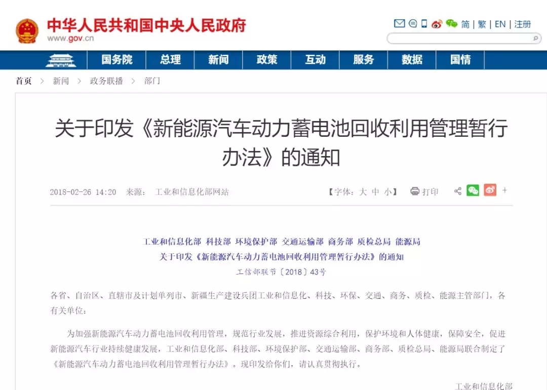2月26日,工業(yè)和信息化部、科技部、環(huán)境保護部、交通運輸部、商務部、質檢總局、能源局印發(fā)《新能源汽車動力蓄電池回收利用管理暫行辦法》的通知,旨在加強新能源汽車動力蓄電池回收利用管理,規(guī)范行業(yè)發(fā)展。