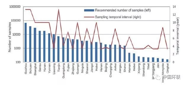 土壤重金屬污染是動(dòng)態(tài)變化的,重金屬濃度隨污染源的輸入和植物吸收、流水等作用輸出的變化而變化。如何在時(shí)間和空間上監(jiān)測(cè)土壤重金屬污染狀況的變化特征亦是一個(gè)不可忽視的重要問題。通過對(duì)前一次樣點(diǎn)的定位,再次采集、分析,比較同一樣點(diǎn)前后兩次土壤重金屬濃度的變化,是最為有效的監(jiān)測(cè)土壤重金屬變化的方式。但因土壤的空間異質(zhì)性、采樣方法和統(tǒng)計(jì)誤差等影響,土壤重金屬濃度變異度的數(shù)值大小可以通過再次采樣而被檢測(cè)是需要考慮的問題。同時(shí),多次大量的樣品采集雖然能夠提高監(jiān)測(cè)精度,但成本也相應(yīng)升高,在操作上不現(xiàn)實(shí)。監(jiān)測(cè)精度和成本的平衡,監(jiān)測(cè)區(qū)域樣品數(shù)量和監(jiān)測(cè)時(shí)間間隔的確定是至關(guān)重要的問題。中國地質(zhì)大學(xué)Xia等在全國土壤調(diào)查的基礎(chǔ)上,以主要行政區(qū)域和主要重金屬污染元素為對(duì)象,研究土壤重金屬污染變化監(jiān)測(cè)的樣品采集數(shù)量和采集時(shí)間間隔,發(fā)現(xiàn)由于研究區(qū)域大的空間變異,很難確定土壤重金屬濃度最小可監(jiān)測(cè)的變異;根據(jù)成本、可實(shí)踐性和檢測(cè)的精度,考慮重金屬元素的變異性和設(shè)定變異程度,針對(duì)不同區(qū)域推薦了一系列合適采樣數(shù)量,不同區(qū)域檢測(cè)的時(shí)間間隔為3.3~13.3 年(圖1)。該研究為區(qū)域性土壤重金屬污染變化監(jiān)測(cè)提供較好的研究思路和方法。