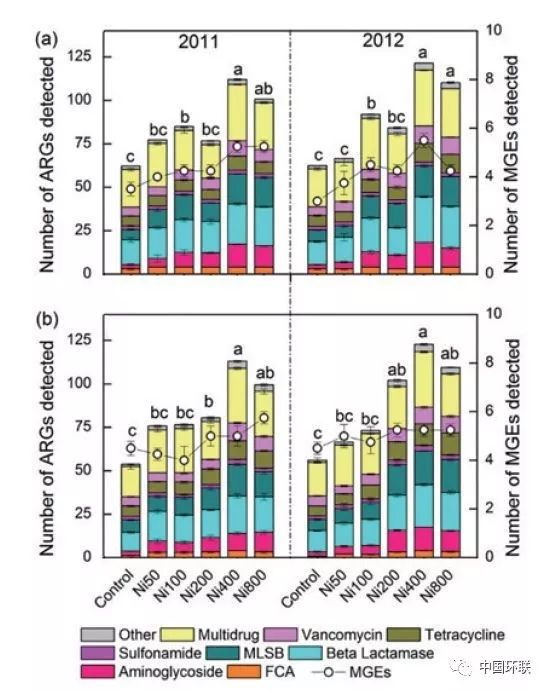 抗生素對(duì)細(xì)菌感染、致病微生物感染類疾病的防治具有重要作用,但由此而來的抗性基因的快速增加和傳播也威脅著人體健康。抗性基因的研究越發(fā)受到學(xué)者關(guān)注,成為研究熱點(diǎn)。除抗生素選擇產(chǎn)生抗性基因外,環(huán)境中重金屬對(duì)抗生素抗性的選擇和傳播擴(kuò)散具有重要作用。中國科學(xué)院生態(tài)環(huán)境研究中心Hu等通過對(duì)Ni長(zhǎng)期污染土壤誘導(dǎo)的抗性基因進(jìn)行研究,發(fā)現(xiàn)在長(zhǎng)期不同程度Ni污染下,共檢測(cè)到149種抗性基因,以多藥和β-內(nèi)酰胺類抗生素抗性為主,抗性基因的頻率和豐度隨Ni污染程度的增加而升高(圖3);抗性基因與可移動(dòng)抗性原件具有顯著相關(guān)性,表明Ni污染增加了抗性基因的水平轉(zhuǎn)移,該水平轉(zhuǎn)移與intI1整合子有關(guān)。區(qū)別于以往重金屬的直接毒性風(fēng)險(xiǎn),該研究闡述了重金屬在土壤環(huán)境中的間接風(fēng)險(xiǎn)-增加抗性基因產(chǎn)生和傳播風(fēng)險(xiǎn)。