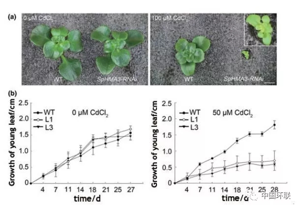 利用超積累植物修復(fù)重金屬污染土壤一直是研究學(xué)者們關(guān)注的焦點(diǎn)。區(qū)別于普通植物,超積累植物地上部可富集高濃度的重金屬。其可能作用機(jī)制為:超積累植物的根際對(duì)土壤重金屬活化效應(yīng);超積累植物對(duì)重金屬具有快速的吸收轉(zhuǎn)運(yùn)體系;超積累植物對(duì)重金屬具有強(qiáng)的解毒儲(chǔ)存能力。浙江大學(xué)Hou等對(duì)比研究重金屬超積累型和非超積累型植物的根際特征,發(fā)現(xiàn)與非超積累型植物相比,超積累型植物根際具有更為龐大的根系,土壤pH值較低,重金屬有效性高;根際土壤重金屬有效性與超積累植物特異的細(xì)菌群落具有顯著相關(guān)性,微生物群落功能分析(PICRUSt)超積累植物根際細(xì)菌豐度相對(duì)較高,其相應(yīng)的功能與膜運(yùn)輸和氨基酸代謝相關(guān)。該研究揭示了超積累植物根際特征,尤其是特異的根際細(xì)菌群落組成對(duì)超積累植物吸收重金屬的作用。除超積累植物特殊的根際效應(yīng)外,其植物本身對(duì)重金屬吸收和存儲(chǔ)能力亦是超積累重金屬主要機(jī)制。浙江大學(xué)Tian等對(duì)超積累型和非積累型東南景天對(duì)Cd吸收、分布以及細(xì)胞水平上耐性進(jìn)行研究。Cd在非積累型植物葉和莖中維管束中有少量分布,而超積累植物Cd含量高,且不同組織和時(shí)間上差異較大;兩種植物在Cd向葉原生質(zhì)運(yùn)輸?shù)膭?dòng)力學(xué)上沒有較大差異,但超積累型在Cd的液泡存儲(chǔ)上更為高效。該研究結(jié)果表明相對(duì)于快速運(yùn)輸至薄壁細(xì)胞,Cd的液泡高效存貯是東南景天莖中積累Cd的更為重要的機(jī)制。超積累植物對(duì)重金屬的積累和解毒機(jī)制受控于體內(nèi)特有基因表達(dá)。中國科學(xué)院植物研究所Liu等對(duì)鎘鋅超積累植物伴礦景天Cd耐性基因進(jìn)行研究,發(fā)現(xiàn)伴礦景天體內(nèi)的ATP酶3基因(SpHMA3)對(duì)其Cd在體內(nèi)解毒具有重要作用,酵母中外源SpHMA3表達(dá)試驗(yàn)表明其具有Cd專一運(yùn)輸活性,對(duì)Cd敏感而對(duì)Zn不敏感,SpHMA3基因在非超積累型景天中超量表達(dá)可增加其對(duì)Cd的耐性和積累性,但對(duì)Zn無效應(yīng)。該研究結(jié)果證實(shí)位于液泡膜上的SpHMA3基因?qū)χ参顲d解毒機(jī)制起著重要作用,能保持伴礦景天在Cd污染土壤上正常生長(zhǎng)(圖5)。