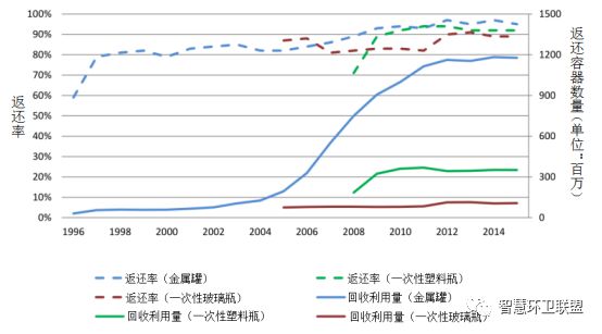 芬蘭的押金體系實(shí)現(xiàn)了極高的回收率。在PALPA體系剛剛成立的1996年,一次性金屬罐的回收率就已經(jīng)達(dá)到了59%,并馬上于第二年上升到了79%。到了2009年,金屬罐的回收率已經(jīng)超過90%。同樣地,PET瓶的押金體系在2008年開始實(shí)施時(shí),返還率就已經(jīng)達(dá)到了71%,之后在兩年內(nèi)便上升到了90%以上。玻璃瓶在芬蘭擁有很長(zhǎng)的押金制度實(shí)施積累,因此在PALPA在建立針對(duì)玻璃瓶的回收體系后,回收率就一直高于80%。從圖11還可以看出,一次性鐵罐的回收量自2004年起至2012年,一直都在迅速上升,并且保持穩(wěn)定的高回收率,反映出芬蘭飲料產(chǎn)業(yè)使用一次性金屬罐替代可重復(fù)使用玻璃瓶的趨勢(shì)。可重復(fù)使用玻璃瓶的回收率則更高,在2014年時(shí)為97%、2015年時(shí)為98%。