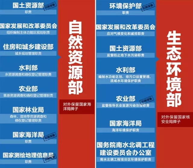 此次改革中,國(guó)土資源部改組為自然資源部,環(huán)境保護(hù)部改組為生態(tài)環(huán)境部,并且均擴(kuò)充了許多新的職能,這是因應(yīng)生態(tài)文明戰(zhàn)略的具體行動(dòng)。十九大報(bào)告提出,“加強(qiáng)對(duì)生態(tài)文明建設(shè)的總體設(shè)計(jì)和組織領(lǐng)導(dǎo),設(shè)立國(guó)有自然資源資產(chǎn)管理和自然生態(tài)監(jiān)管機(jī)構(gòu)”。