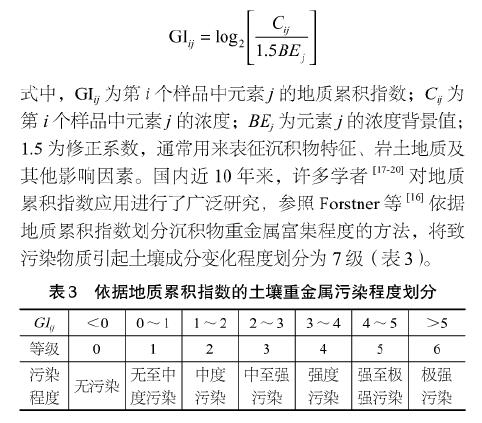 5)致污物質對土壤物質成分的影響程度評價。除了規(guī)范HJ/T166規(guī)定的內梅羅指數(shù)法,還可選用地質累積指數(shù)法。地質累積指數(shù)(geoaccumulationindex,GI)是法國科學家Muller[14]于1969年提出的用于定量評價沉積物(或其他物質)中重金屬富集程度的指標[15,16],其表達式如下: