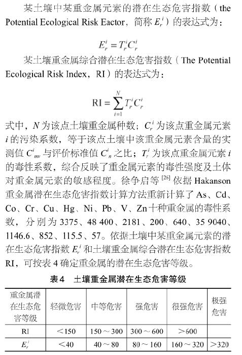6)致污染物質的潛在生態(tài)危害評價。潛在生態(tài)危害指數(shù)法是瑞典地球化學家Hakanson于1980[21]創(chuàng)建的,是以沉積學原理評價環(huán)境重金屬污染及其生態(tài)危害的方法。由于該方法同時考慮了重金屬的種類、濃度、毒性水平及土體對重金屬的敏感性等因素,較為科學合理,因此,被廣泛應用于土壤環(huán)境質量評價,國內有不少學者[22-26]在評價土壤環(huán)境質量時應用了這種方法,并進行了較深入的研究。