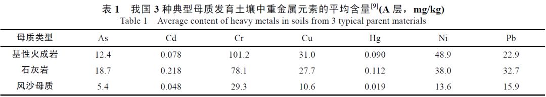 20世紀(jì)80年代進(jìn)行的中國(guó)土壤元素背景值調(diào)查結(jié)果表明,不同類(lèi)型母質(zhì)上發(fā)育的土壤,其重金屬含量的差異很大,如As、Cd、Cr、Cu、Hg、Ni和Pb等元素在基性火成巖和石灰?guī)r母質(zhì)發(fā)育的土壤中的平均含量大大高于風(fēng)沙母質(zhì)土壤。