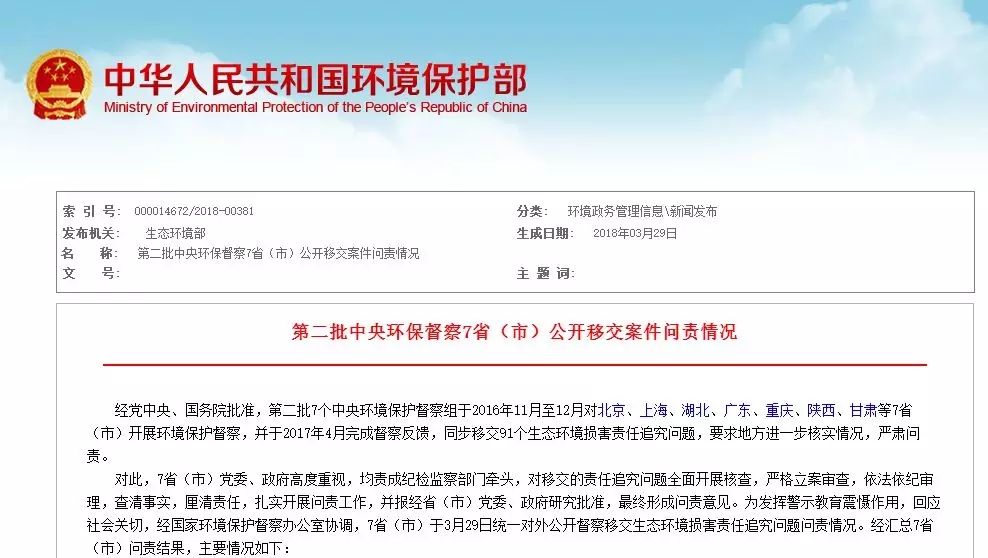 3月29日,北京、上海、湖北、廣東、重慶、陜西、甘肅等7省(市)對(duì)外公開(kāi)了第二批中央環(huán)保督察移交生態(tài)環(huán)境損害責(zé)任追究問(wèn)題問(wèn)責(zé)情況。