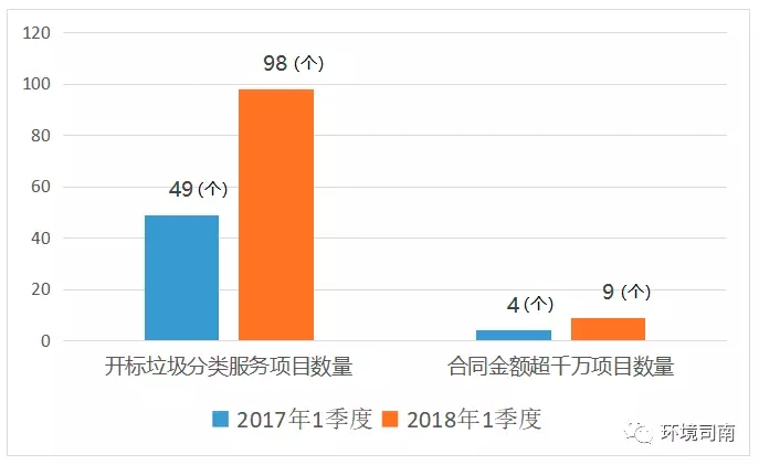 強(qiáng)制垃圾分類試點(diǎn)、農(nóng)村垃圾治理、農(nóng)村人居環(huán)境整治三年行動(dòng)等相關(guān)政策的陸續(xù)出臺(tái)和持續(xù)推進(jìn),農(nóng)村垃圾治理、垃圾分類等非傳統(tǒng)環(huán)衛(wèi)項(xiàng)目不斷涌現(xiàn)。2018年1季度與去年同期相比,垃圾分類和農(nóng)村垃圾治理的項(xiàng)目數(shù)量和中標(biāo)金額均出現(xiàn)倍增。