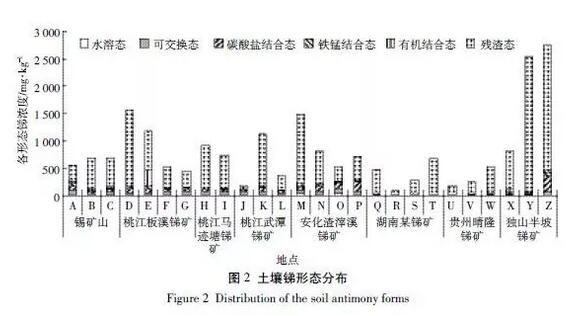 銻的金屬性不強(qiáng),易形成銻的衍生物(銻化物、氫化物、有機(jī)銻化物等),其毒性的大小不僅與其總量有關(guān),很大程度上還取決于其存在形態(tài)。其中單質(zhì)銻的毒性高于其鹽類,無(wú)機(jī)銻的毒性高于有機(jī)銻,+3 價(jià)的毒性高于+5 價(jià)(+3 價(jià)的毒性大約是+5 價(jià)的10 倍),且同等價(jià)態(tài)銻的毒性還與其化合物的形態(tài)以及晶體結(jié)構(gòu)有關(guān)。銻在土壤中主要以殘?jiān)鼞B(tài)的形式存在,占總銻的比例最高可達(dá)90%,水溶態(tài)含量最低(圖 2)。