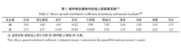 土壤中銻形態(tài)的分布特征會(huì)對(duì)其在土壤-植物體系中的富集轉(zhuǎn)運(yùn)能力產(chǎn)生一定影響。相關(guān)研究者比較了蜈蚣草、斑矛、五節(jié)芒、粽葉蘆對(duì)砷和銻的轉(zhuǎn)運(yùn)能力,發(fā)現(xiàn)只有五節(jié)芒和粽葉蘆從根部到地上部(莖/葉)對(duì)銻具有較好的轉(zhuǎn)運(yùn)能力,而4 類植物對(duì)砷都表現(xiàn)出了良好的轉(zhuǎn)運(yùn)能力,說(shuō)明銻在植物體中的轉(zhuǎn)運(yùn)能力相對(duì)于砷較弱。文吉昌等的研究結(jié)果(表 2)表明,除了個(gè)別植物對(duì)銻的富集能力大于砷外,其余植物對(duì)銻的富集能力均遠(yuǎn)小于砷。也有研究表明,植物地上部的銻含量與根部含量之間沒(méi)有相關(guān)性(r=0.19),植物吸收的銻并非單一來(lái)自土壤的釋放,還有一部分可能來(lái)自大氣沉降,進(jìn)一步表明了銻在植物中具有較弱的富集轉(zhuǎn)運(yùn)能力。