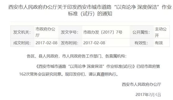 2017年2月8日,西安市政府辦公廳發(fā)布《西安市城市道路“以克論凈 深度保潔”作業(yè)標(biāo)準(試行)》(下稱《標(biāo)準》),對城市道路清掃保潔作業(yè)標(biāo)準進行了明確規(guī)定。該《標(biāo)準》將西安市道路清掃保潔等級劃分為重點區(qū)域、一級、二級、三級道路,并要求每平方米灰塵分別不超過5克、10克、15克和20克。