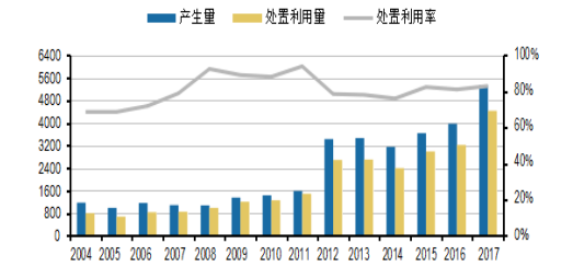 據(jù)國家統(tǒng)計局?jǐn)?shù)據(jù)顯示,2017年我國危險廢物產(chǎn)生量5340萬噸,較去年增長34.49%。其中綜合利用2800萬噸,處置1600萬噸,綜合處置利用率高達(dá)83%。