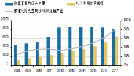 2017年我國全國危險廢物經(jīng)營單位核準(zhǔn)經(jīng)營規(guī)模已達(dá)到6471萬噸/年(統(tǒng)計產(chǎn)量5347萬噸,測算產(chǎn)量8052萬噸),表象上看產(chǎn)能充足但實際仍有1581萬噸的缺口,當(dāng)前危廢資質(zhì)總體上僅能覆蓋80%的危廢產(chǎn)量。