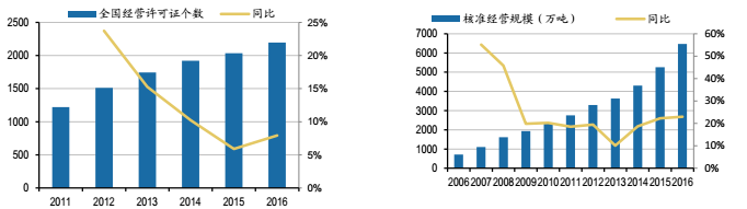 自2006年以來,我國危廢經(jīng)營許可證發(fā)放數(shù)量增速呈下降趨勢。嚴(yán)格的資質(zhì)管理制度是危廢處理行業(yè)最重要的行業(yè)壁壘,并在一定程度上限制了危廢處理產(chǎn)能的快速擴(kuò)張。