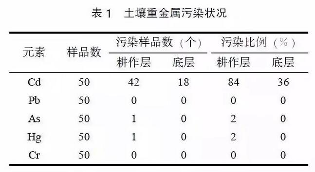 為研究污染場(chǎng)地對(duì)周邊農(nóng)田土壤重金屬的影響程度,選取國(guó)家GB 15618-1995 《土壤環(huán)境質(zhì)量標(biāo)準(zhǔn)》中的2 級(jí)標(biāo)準(zhǔn)作為閾值。采用單因子指數(shù)法對(duì)水泥廠周邊農(nóng)田表層土壤總體環(huán)境質(zhì)量現(xiàn)狀進(jìn)行評(píng)價(jià),結(jié)果如表1 所示。水泥廠周邊農(nóng)田土壤Pb和Cr 沒(méi)有呈現(xiàn)污染特征,但土壤As 和Hg 已呈輕度污染,分別有1 個(gè)樣點(diǎn)質(zhì)量分?jǐn)?shù)超標(biāo),超標(biāo)率為2%;而土壤Cd的污染已較為嚴(yán)重,超標(biāo)樣點(diǎn)數(shù)達(dá)42 個(gè),超標(biāo)率高達(dá)84%。同時(shí)又采用內(nèi)梅羅污染指數(shù)法進(jìn)行綜合評(píng)價(jià),以綜合指數(shù)大于1 為臨界值。結(jié)果表明,石灰廠周邊農(nóng)田耕作層土壤共有33 個(gè)樣點(diǎn)超標(biāo),超標(biāo)率達(dá)66%,最大值達(dá)到1.90;底層土壤共有6 個(gè)樣點(diǎn)超標(biāo),超標(biāo)率達(dá)12%,最大值達(dá)到1.72。根據(jù)《農(nóng)田土壤環(huán)境質(zhì)量監(jiān)測(cè)技術(shù)規(guī)范》土壤污染分級(jí)標(biāo)準(zhǔn),該區(qū)域?yàn)檩p度污染等級(jí)。