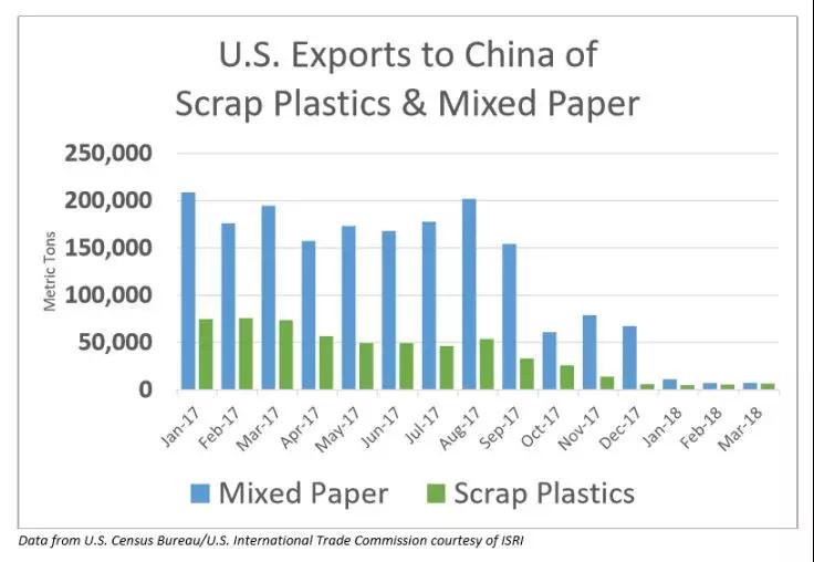 2017.1-2018.3美國(guó)出口中國(guó)的塑料廢品和紙質(zhì)廢品數(shù)量變化