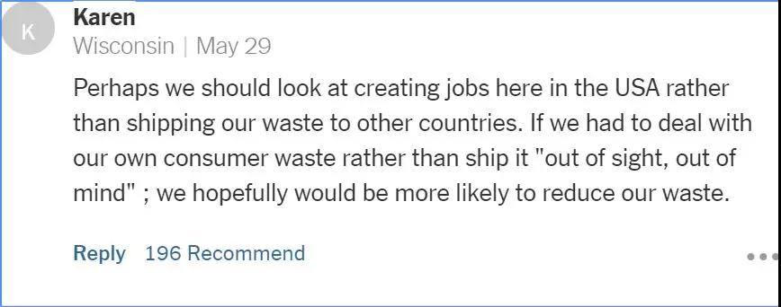 “我們應(yīng)該致力于在美國(guó)國(guó)內(nèi)創(chuàng)造更多的垃圾處理相關(guān)的就業(yè)崗位,而不是把垃圾轉(zhuǎn)運(yùn)到其他國(guó)家。如果我們能意識(shí)到自行處理垃圾是件多么困難的事情的話,我們的浪費(fèi)也就自然而然減少了?!?/p>