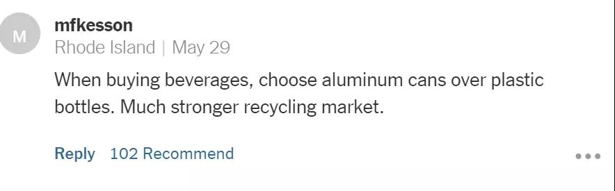 “當(dāng)我們買飲料時(shí),應(yīng)該盡量買那些鋁制罐裝的而不是塑料的。鋁材質(zhì)有著更強(qiáng)大的回收市場(chǎng)。”