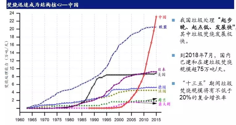 接著分別介紹了全球不同區(qū)域的垃圾處理狀況,分析了歐州、英國、美國、日本等國家的垃圾處理能力,總結(jié)了國際垃圾處理的發(fā)展形勢:英國垃圾焚燒成為歐洲最大的新興市場;日本不同類型焚燒設施總數(shù)減少但大廠增加,總處理量基本穩(wěn)定,發(fā)展相對成熟;美國近年來處于停滯狀態(tài);中國的垃圾處理發(fā)展正在進入全速發(fā)展階段。