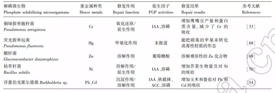 近年來(lái),具有重金屬解毒能力和促進(jìn)植物生長(zhǎng)功能的解磷微生物在土壤重金屬污染修復(fù)中被應(yīng)用和探索, 如表 2 所示。